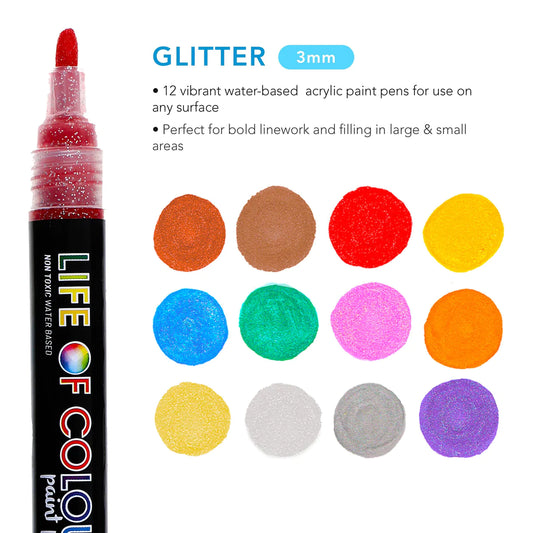 Medium Tip Acrylic Paint Pens - Set of 12 - Glitter