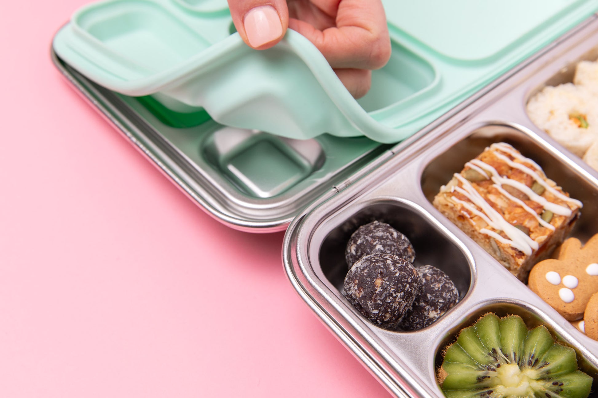 The leak-proof silicone seal keeps foods securely separated — ideal when you want to send wet items (like yoghurt or hummus) next to crackers or fruit without sogginess.