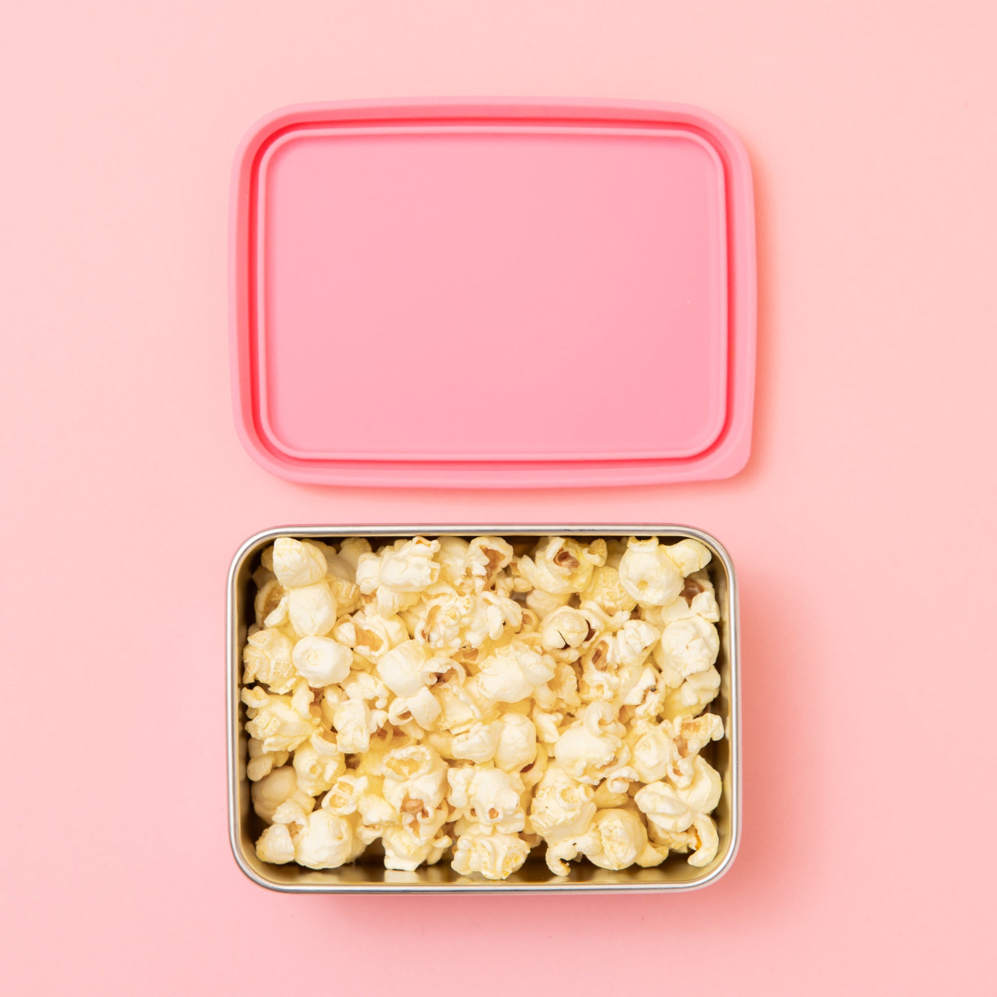 Think popcorn for movie-day lunches, pretzels for crunch, cut-up fruit for freshness, or a slice when you’ve had time to bake. It’s just as happy holding slices or cookies, too. This box is for real families, real appetites, and real food – no cling wrap required.