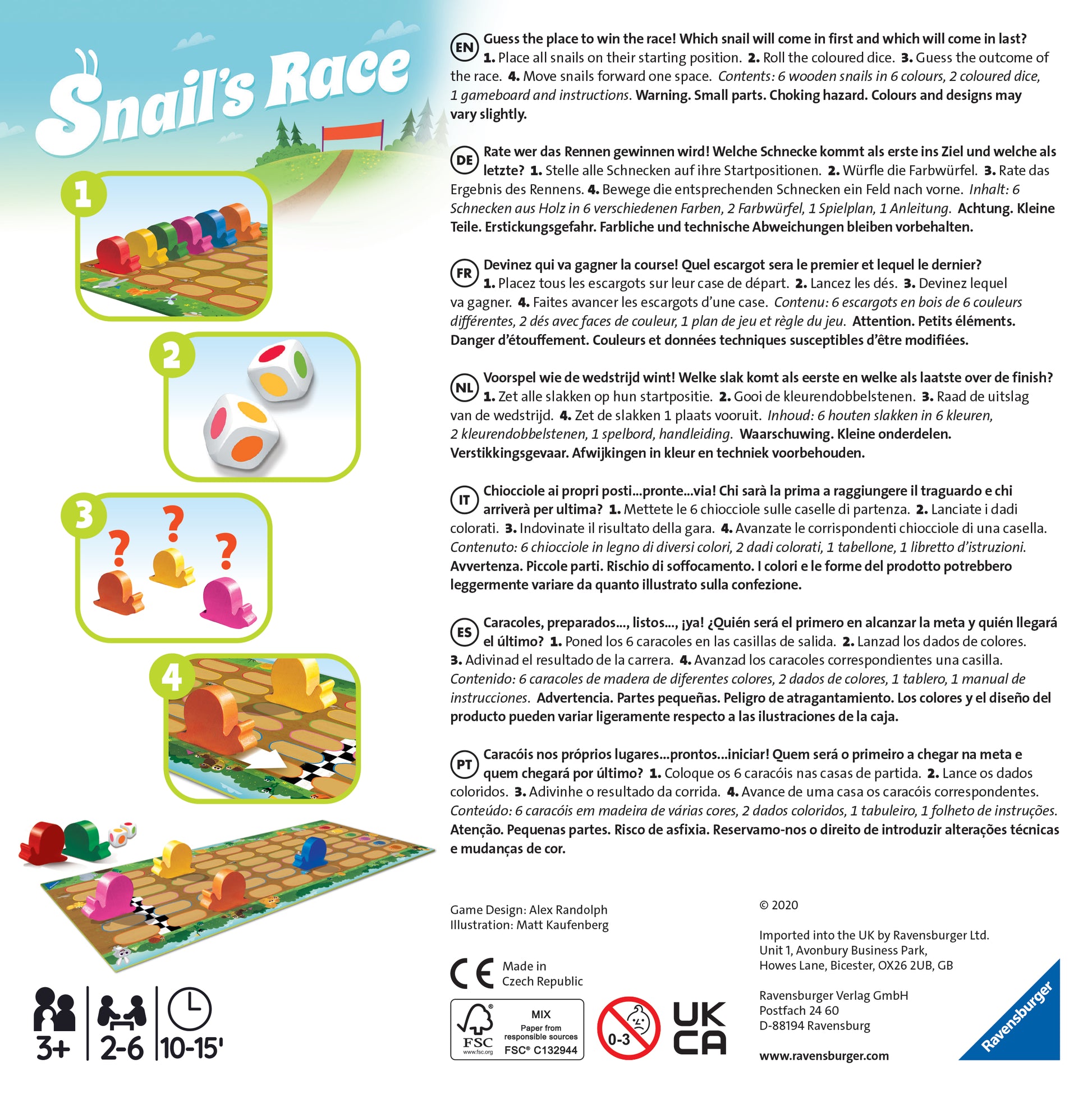 This no-reading, quick-play game features six brightly-coloured wooden garden snails that players move across a colourful game board according to the roll of the dice.